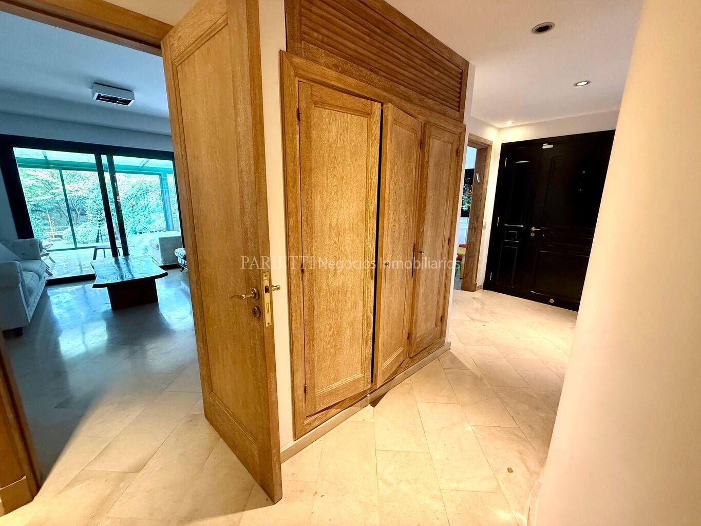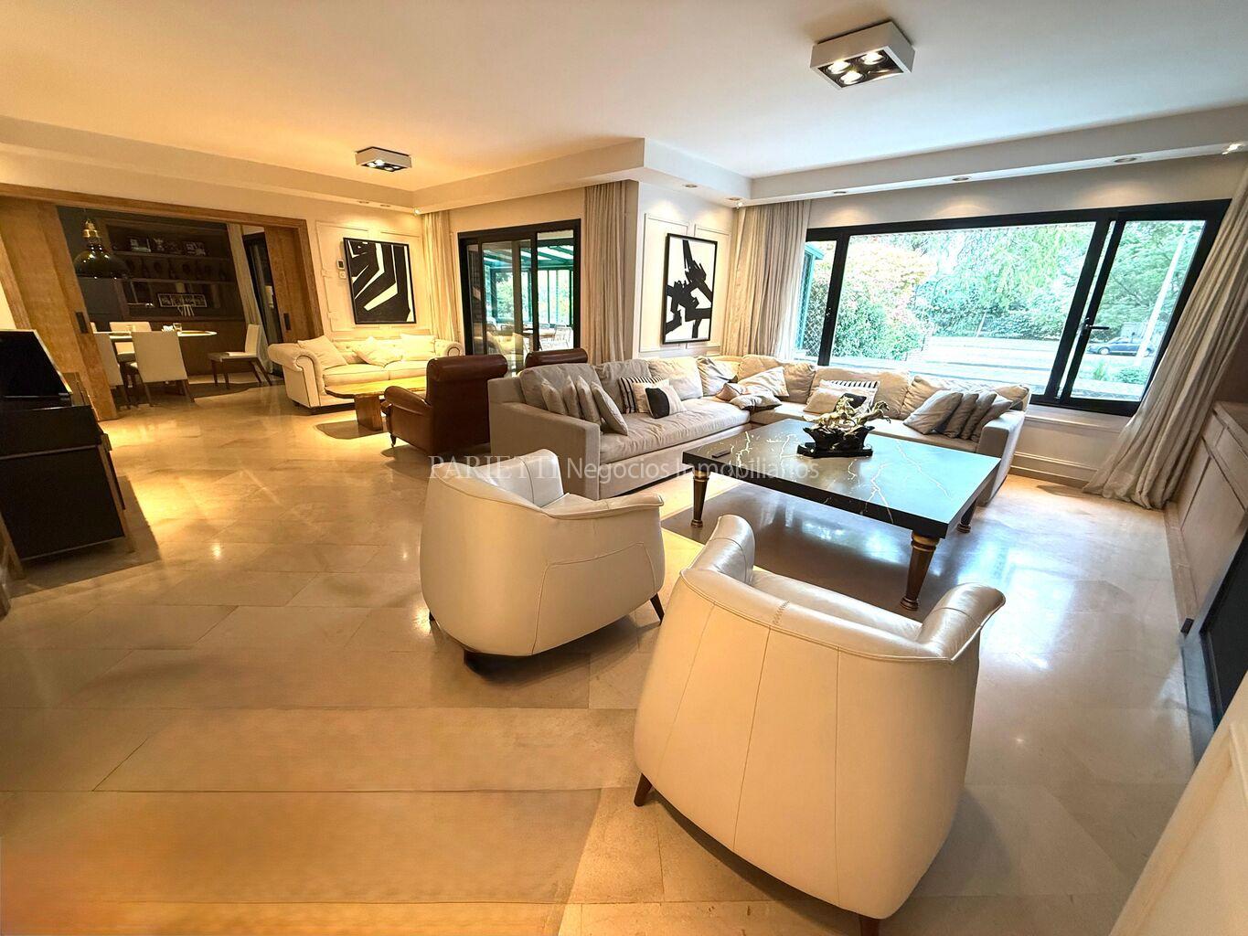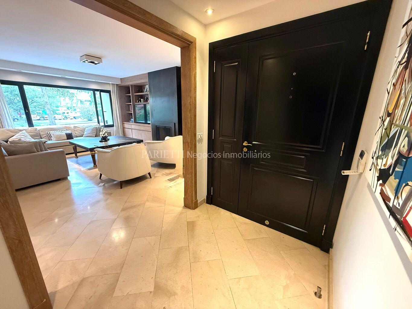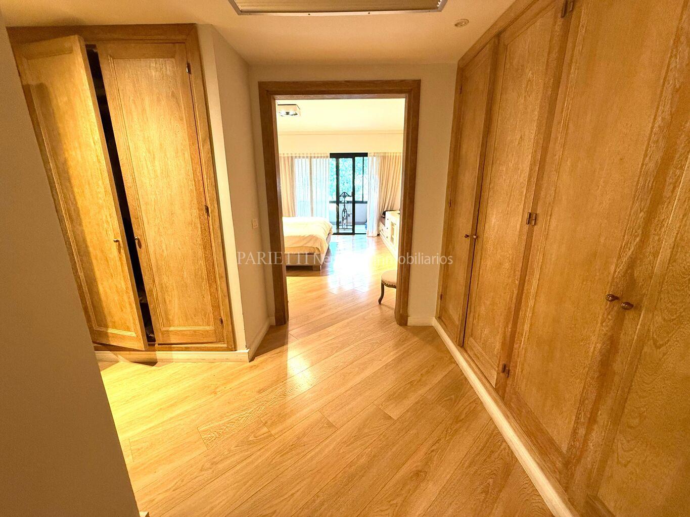 Pallier, toilette, living-comedor amplio, estar con estufa a leña, con salida a espectacular terraza cubierta , con parrillero y conexión al jardín de uso exclusivo. Cocina, terraza la lavadero, servicio completo, 3 dormitorios ( suite con vestidor), 2 baños. 3 Garajes. Gran box. Aire Acondicionado Central y losa radiante.