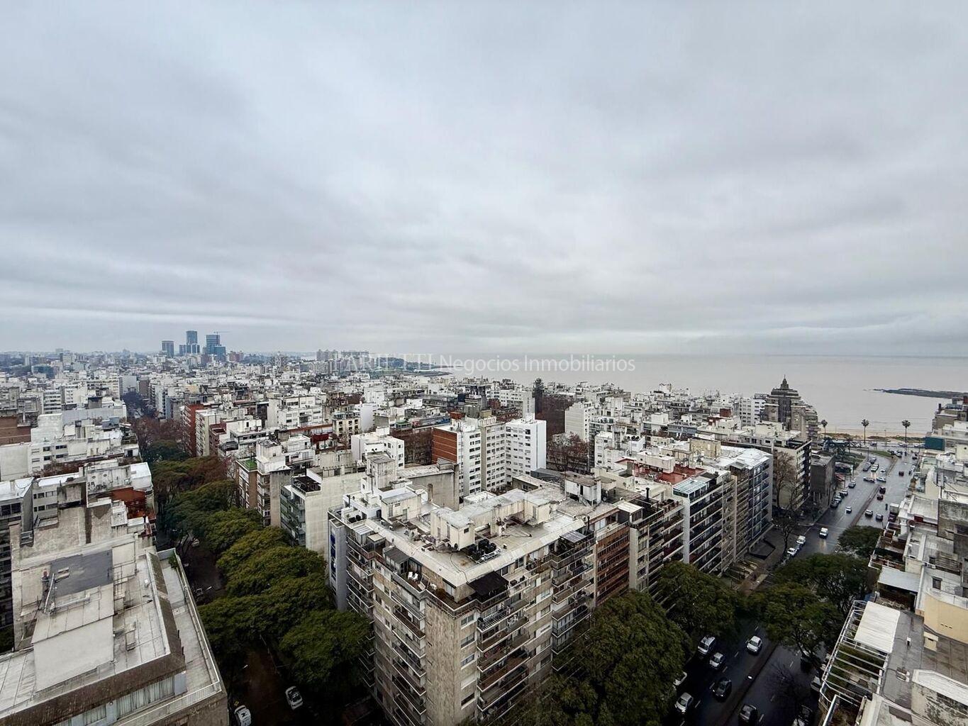 Impresionante vista de la Ciudad. A pocas cuadras de la Rambla. Pallier, living-comedor, con salida a gran terraza. Toilette, 3 dormitorios ( suite con vestidor ), 2 baños, cocina, servicio completo. Garaje para 2 autos. Calefacción por losa central del Edificio, incluída en las expensas.